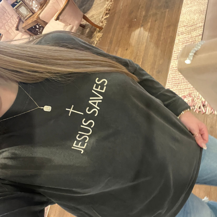 “Jesus Saves” Embroidered Long Sleeve Graphic Tee, Black